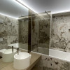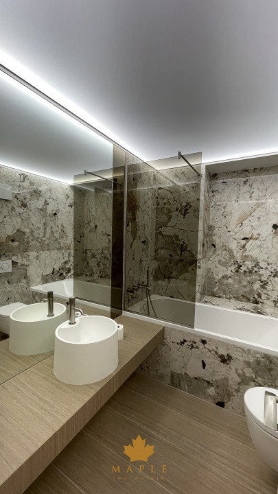 Baia este un adevărat statement de stil, cu finisaje deosebite,, cadă încastrată, obiecte sanitare suspendate și lavoar modern pe blat, toate într-o cromatică elegantă și exclusivistă.