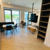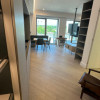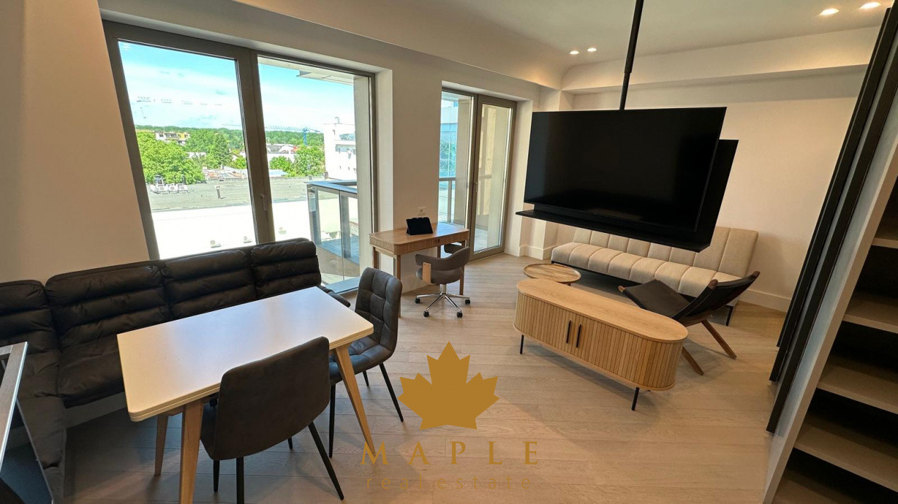 Livingul open-space integrează o zonă de dining și un colț de relaxare, având piese de mobilier atent alese: canapea modernă, scaune design, masă practică și un televizor cu ecran mare, montat minimalist. Bucătăria este discret integrată, oferind toate dotările necesare.