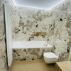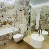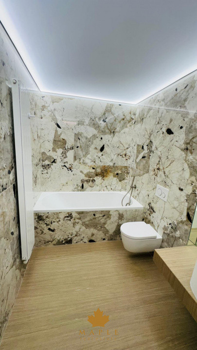 Baia este un adevărat statement de stil, cu finisaje deosebite,, cadă încastrată, obiecte sanitare suspendate și lavoar modern pe blat, toate într-o cromatică elegantă și exclusivistă.