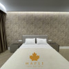 • Dormitor matrimonial spațios, cu pat tapițat și perete decorativ texturat, care adaugă profunzime și caracter camerei.