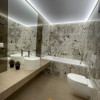 Baia este foarte elegante, cu finisaje premium – faianță cu aspect de marmură, lavoar pe blat (tip vas), oglinzi mari și cada. Iluminarea este modernă, cu barisol.
