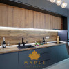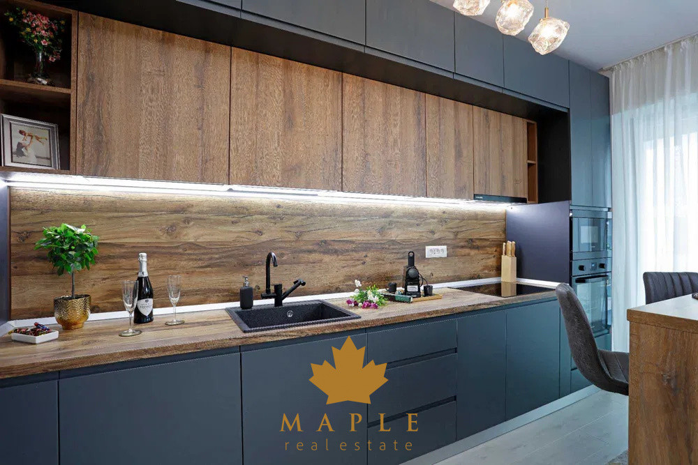Bucataria este complet mobilata cu o multitudine de spatii de depozitare si utilata cu electrocasnice noi incorporate (frigider Beko si masina de spalat vase Hansa, plita, hota, cuptor electric si cuptor cu microunde - toate Samsung cu clasa energetica eficienta). Pe langa farfurii, tacamuri, pahare, oale speciale pentru inductie si altele - toate noi, bucataria are insula cu doua locuri de luat masa si expresor inclus pentru cafea.