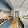 • Bucătărie închisă cu perete vitrat, design contemporan, complet echipată