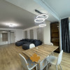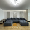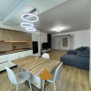 Zona de zi este open space, spațioasă și primitoare, cu o canapea modulară confortabilă și o zonă de dining generoasă. Bucătăria este complet mobilată și utilată, cu electrocasnice încorporate (cuptor, plită gaz, hotă, mașină de spălat vase), fronturi mate, design contemporan și iluminare LED ambientală.