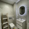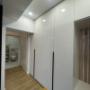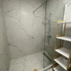 Dormitorul oferă un ambient relaxant, cu pat matrimonial, dressing generos și acces la terasă. Baia este placată cu plăci ceramice tip marmură, dotată cu obiecte sanitare moderne, oglindă cu iluminare LED și mobilier suspendat alb.