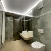 Baile sunt foarte elegante, cu finisaje premium – faianță cu aspect de marmură verde, lavoare pe blat (tip vas), oglinzi mari și duș walk-in cu pardoseală din lemn. Iluminarea este modernă, cu tarvertin.