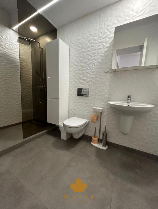 Baile sunt finisate modern, cu duș walk-in și obiecte sanitare de calitate.
